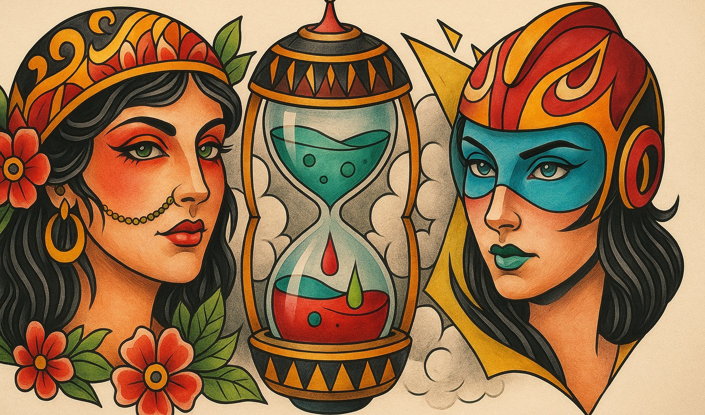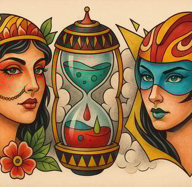 My tattoos aren't decoration. They are chapters. The falling sand is the hourglass I almost broke, the warning that I am not eternal and that every day counts. The gypsy amulet reminds me of my roots and my shadows, the tempting path that is always there and to which I must not return. The piece in the middle speaks of my chemistry, of the substances that now regulate me and keep me stable, not those that once destroyed me.